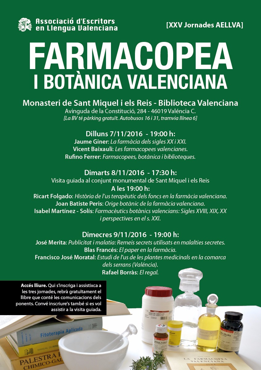 El lunes 7 de noviembre comienzan las XXV Jornadas de l’Associació d’Escritors en Llengua Valenciana (AELLVA), que este año se dedicarán a “FARMACOPEA Y BOTÁNICA VALENCIANA”. La cita que se celebrará durante los días 7, 8 y 9 de noviembre en el salón de actos de la Biblioteca Valenciana, en el Monasterio de San Miguel y los Reyes, de Valencia, será sin duda un recorrido por la historia de la farmacia valenciana.